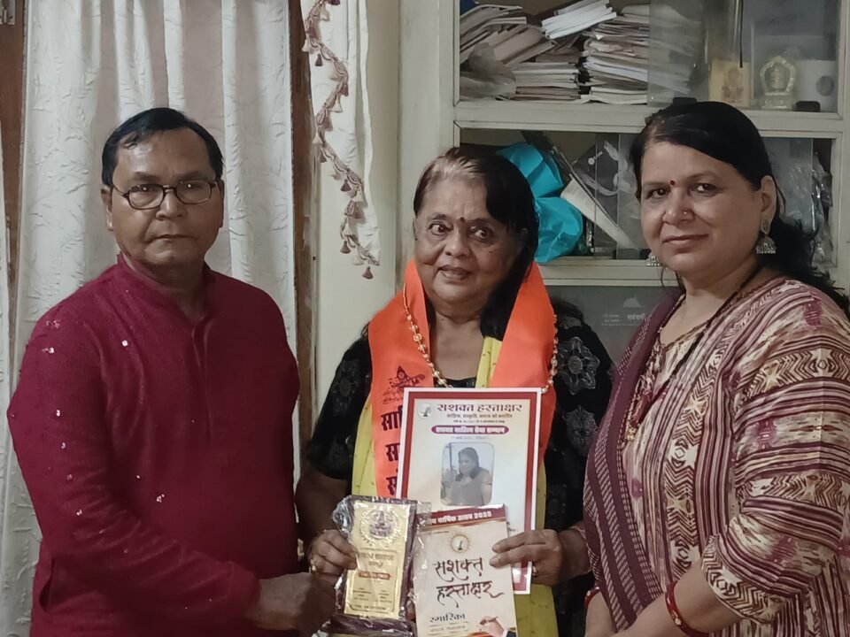 कवि संगम त्रिपाठी संस्थापक प्रेरणा हिंदी प्रचारिणी सभा ने विज्ञप्ति में बताया कि इस अवसर पर ज्योति मिश्रा व गणेश श्रीवास्तव प्यासा जबलपुरी संस्थापक सशक्त हस्ताक्षर ने उनके स्वास्थ्य को दृष्टिगत रखते हुए उनके सदन में हिंदी रत्न सम्मान प्रदान किया।
