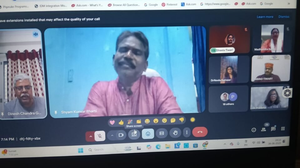 neerajtimes.com झारखण्ड – कहानीका हिंदी पत्रिका के झारखण्ड अध्याय द्वारा दिनांक 26 जून 2025 को संध्या 6.00 योग एवं संगीत दिवस पर झारखंड अध्याय द्वारा एक आभासी कवि सम्मेलन का आयोजन किया गया जिसमें मुख्य अतिथि के रूप में श्री सरोज झा , प्रांतीय महासचिव ,राष्ट्रीय कवि संगम झारखंड इकाई,विशिष्ट अतिथि * सभा अध्यक्ष श्री दिनेश रविकर ,प्रांतीय काव्य गुरु,राष्ट्रीय कवि संगम झारखंड ईकाई, ने भाग लिया।मुख्य अतिथि सरोज झा ने अपने संबोधन में भारत के योग ,।संगीत और संस्कृति पर अपने सुंदर विचार प्रस्तुत किया और बेहद संदेशपूर्ण गजल पाठ कर सबको मंत्रमुग्ध कर दिया।मंच संचालन डॉ नीलू शुक्ला समीर,भोपाल, एम.पी.ने किया।