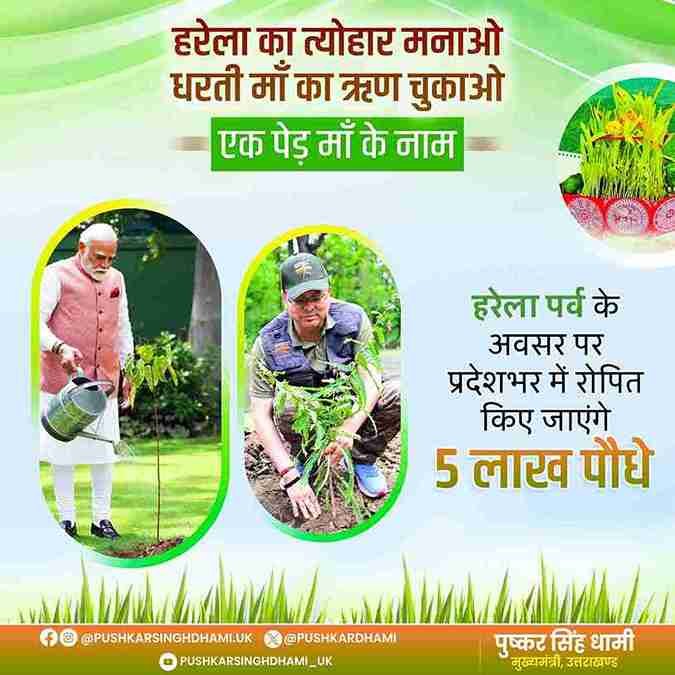 इस वर्ष हरेला पर्व पर उत्तराखंड पौधरोपण पर रिकॉर्ड बनाने जा रहा है। इस दिन पूरे प्रदेश में एक ही दिन में 05 लाख से अधिक पौधे रोपे जाएंगे। जिसमें से गढ़वाल मंडल में 03 लाख और कुमाऊं मंडल में 02 लाख पौधे रोपण का लक्ष्य रखा गया है। इसके लिए शासन स्तर पर सभी तैयारियां पूरी कर ली गई हैं। मुख्यमंत्री श्री पुष्कर सिंह धामी के निर्देश पर इस बार हरेला का त्योहार मनाओ, धरती मां का ऋण चुकाओ और एक पेड़-माँ के नाम की थीम पर यह पौधरोपण आयोजित किया जाएगा। पूरे माह इस पर्व के तहत कार्यक्रमों का आयोजन किया जाएगा।