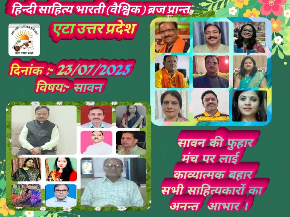 neerajtimes.com सुधीर श्रीवास्तव – हिंदी भाषा और साहित्य के वैश्विक प्रचार-प्रसार हेतु समर्पित संस्था हिंदी साहित्य भारती (वैश्विक) ब्रज प्रांत इकाई के तत्वावधान में सावन पर आधारित प्रथम ऑनलाइन सावनोत्सव काव्य गोष्ठी का भव्य आयोजन किया गया। यह सृजनात्मक आयोजन 4:00 बजे सायं से लेकर रात्रि 7:00 बजे तक अविरत रूप से चला।