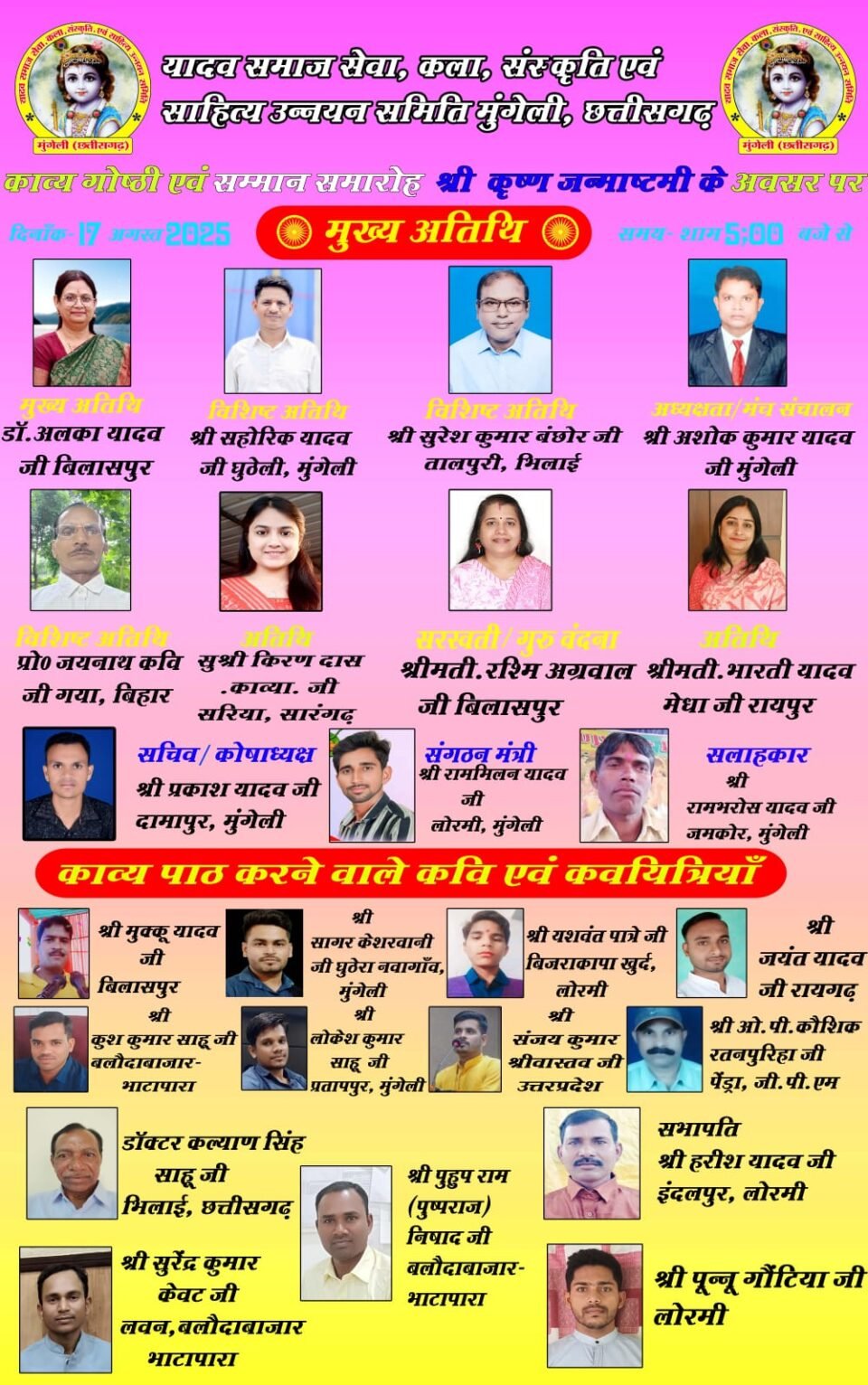 neerajtimes.com मुंगेली। यादव समाज सेवा, कला, संस्कृति एवं साहित्य उन्नयन समिति मुंगेली, छत्तीसगढ़ के द्वारा 17 अगस्त 2025 को विश्व गुरु प्रभु श्री कृष्ण जन्माष्टमी के पावन अवसर पर ऑनलाइन काव्य गोष्ठी एवं सम्मान समारोह आयोजित किया गया। सरस्वती वंदना रश्मि अग्रवाल बिलासपुर और मोहित कुमार शर्मा दुर्ग ने प्रस्तुत किये। मुख्य अतिथि डॉक्टर अलका यादव बिलासपुर ने कहा कि कर्म प्रधान है। कठिन परिश्रम से ही सफलता मिलती है। विशिष्ट अतिथि सहोरिक यादव घुठेली मुंगेली, सुरेश कुमार बन्छोर तालपुरी भिलाई, प्रो. जयनाथ कवि गया, बिहार रहे। अतिथि किरण दास काव्या सरिया, सारंगढ़ रहे। अध्यक्षता एवं मंच संचालन का कार्य समिति के संस्थापक एवं अध्यक्ष अशोक कुमार यादव मुंगेली ने किया। विशेष सहयोगी सचिव एवं कोषाध्यक्ष प्रकाश यादव दामापुर, मुंगेली थे। काव्य पाठ करने वाले कवि एवं कवित्रियाँ- ओ.पी.कौशिक रतनपुरिहा पेंड्रा, सागर केशरवानी घुठेरा नवागाँव मुंगेली, यशवंत पात्रे बिजराकापा खुर्द लोरमी, कुश कुमार साहू बलौदा बाजार-भाटापारा, लोकेश कुमार साहू प्रतापपुर मुंगेली, जयंत यादव रायगढ़, पुहुप राम पुष्पराज निषाद बलौदा बाजार-भाटापारा, मुक्कू यादव बिलासपुर, संजय कुमार श्रीवास्तव उत्तर प्रदेश, रामभरोस यादव जमकोर मुंगेली, सुरेंद्र कुमार केवट लवन बलौदाबाजार भाटापारा, हरीश यादव इंदलपुर लोरमी, पून्नू गौंटिया लोरमी मुंगेली सहित सभी साहित्यकारों ने हे कृष्ण कन्हैया, जय हो छत्तीसगढ़ महतारी, मंय ग्वाला, मिशन सिंदूर, राखी बाँधे ल कब आबे बहिनी, नटखट नंदकिशोर चितचोर, मंय जाँव कहाँ मोला जघा बतादे, बढ़ गए हैं दुराचारी, कैसी लगन लागी रे श्याम, हे मनमोहन! हे मुरलीधर!, राखी लेकर बहना आई, मैं तो जाऊँ गोकुल मथुरा, ये तिरंगा है महान, बोली बोले रे कोयलिया, हम तो देशभक्त हैं, कभी हिंदी बोलती है इत्यादि विषय पर हिंदी एवं छत्तीसगढ़ी में काव्य पाठ किये। सभी साहित्यकारों को कवि विन्द विशारद सम्मान से अलंकृत किया गया। आभार प्रदर्शन समिति के अध्यक्ष अशोक कुमार यादव ने किया।