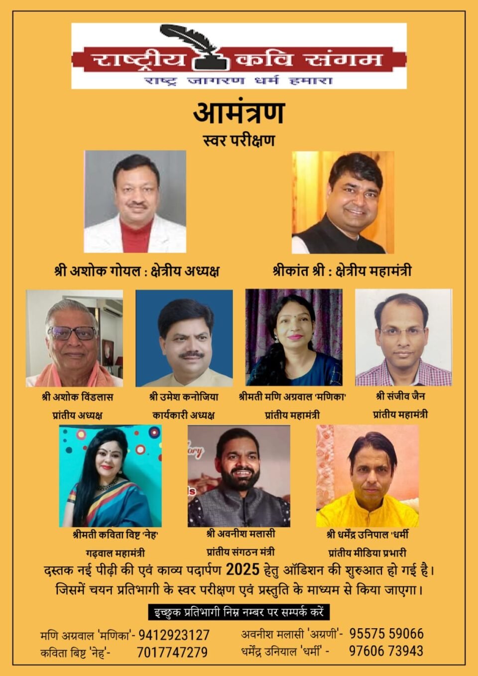 neerajtimes.com देहरादन – हर वर्ष की भाँति राष्ट्रीय कवि संगम उत्तराखंड इस बार भी “दस्तक नई पीढ़ी की” एवं “काव्य पदार्पण” का आयोजन आयोजित करने जा रहा है। जिसके प्रतिभागियों का चयन स्वर परीक्षण (ऑडिशन) के माध्यम से किया जाएगा। जिसके आयोजन की तिथि से शीघ्र ही अवगत करवा दिया जाएगा। चयनित प्रतिभागियों को लेकर दिसम्बर माह में विशाल कवि सम्मेलन किया जाएगा। यह ऑडिशन राउंड सम्पूर्ण उत्तराखंड के लोगों के लिए खुला है। जो भी इसमें प्रतिभाग करना चाहें वो नीचे दिए गए नियमों को ध्यानपूर्वक पढ़ें।