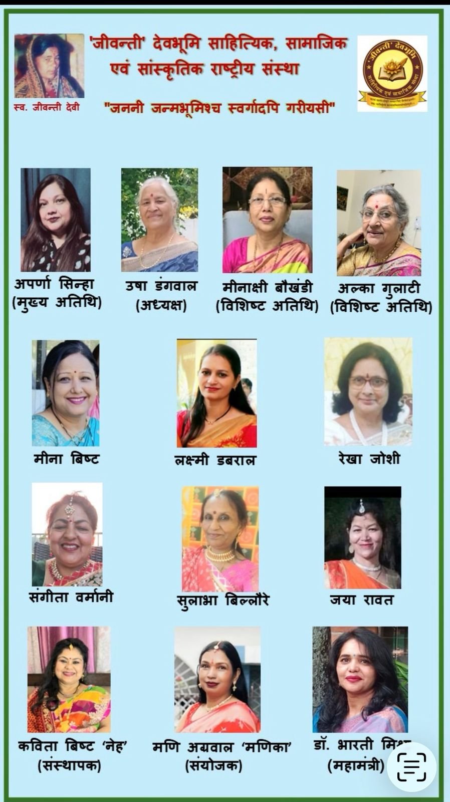 श्रीमती कविता बिष्ट ‘नेह’ (अध्यक्ष), डॉ. भारती मिश्रा (महामंत्री) जीवन्ती देवभूमि साहित्यिक, सामाजिक एवं सांस्कृतिक राष्ट्रीय संस्था