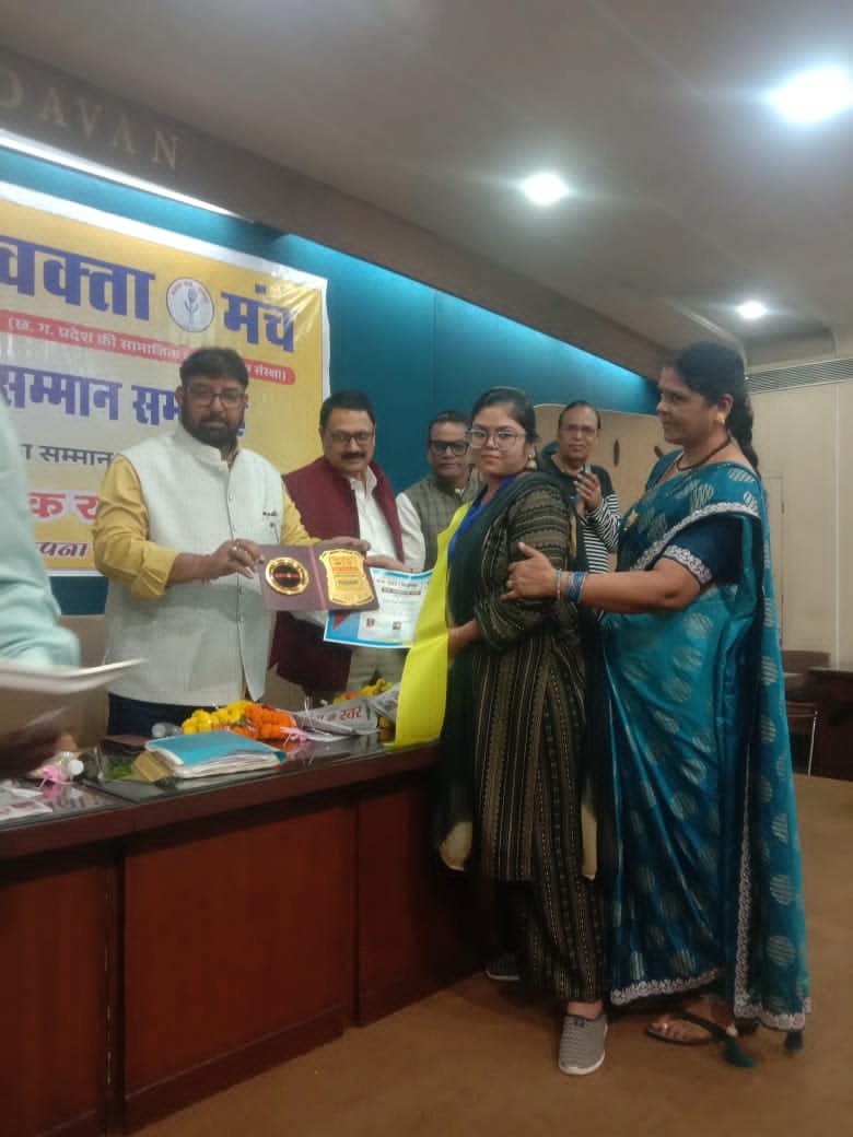 शिखा को उससे पहले भी दो बार वक्ता मंच से सम्मानित किया जा चुका है। वक्ता मंच और दबंग स्वर की प्रशंसा करते हुए निहारिका ने कहा कि वक्ता मंच का प्रयास सराहनीय है। उनके समाजपयोगी कार्य की जितनी प्रशंसा की जाएं कम है। राजेश पराते जी और शुभम साहू जी निरंतर वक्ता मंच के ज़रिए लोगो की सेवा मै जुटे हुऐ हैं।