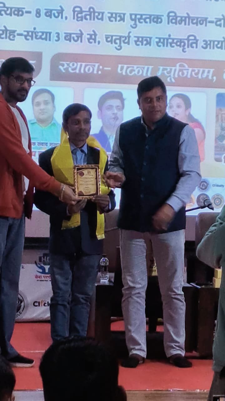 neerajtimes.com बिहार/समस्तीपुर – पटना संग्रहालय सभागार में मगध महोत्सव साहित्यिक व सांस्कृतिक कार्यक्रम में समस्तीपुर जिले के मोरवा अंचल के सारंगपुर पूर्वी पंचायत के कृषक उपेन्द्र राय व धर्मपरायण माता कुमारी निशा सिन्हा के होनहार सुपुत्र व सुविख्यात लेखक प्रकाश राय को कार्यक्रम के मुख्य अतिथि व डिप्टी कमिश्नर, स्टेट टैक्स डिपार्टमेंट, बिहार के श्री समीर परिमल ने पटना संग्रहालय सभागार के साहित्यिक व सांस्कृतिक रंगमंच पर बीते रविवार को प्रशस्ति पत्र से सम्मानित किया। मातृभाषा हिन्दी संगठन के आयोजक कुमार लक्ष्मीकांत ने कहा कि प्रकाश राय एक शानदार बहुमुखी प्रतिभा के धनी बादशाह है। जिनकी लेखनी बड़ी कमाल है। संयोजक सुभाष शर्मा ने कहा कि प्रकाश राय एक प्राकृतिक लेखक व संवेदनशील व्यक्ति हैं। जिनकी लेखनी में बहुत ही गहराई होती है। मंच संचालिका व वीर-रस की कवयित्री वर्षा ठाकुर ने कहा कि श्री राय साहब एक सक्रिय लेखक हैं एवं साहित्य जगत् के उभरते सितारे हैं। जिसके लिए उन्हें प्रशस्ति-पत्र से सम्मानित किया गया। इस अवसर पर भूतपूर्व केन्द्रीय मंत्री अश्विनी कुमार चौबे, भूतपूर्व केन्द्रीय मंत्री डॉ. सीपी ठाकुर, भारतीय प्रशासनिक सेवा के अधिकारी आशीष कुमार, सह आयोजक निर्भय कांत सहित बिहार के कई वरिष्ठ कवियों ने साहित्य पर अपने विचार प्रकट किए एवं आयोजन के महत्ता पर प्रकाश डाला। भारत सहित विविध प्रांतों के वरिष्ठ कवियों ने अपनी प्रस्तुति दी जिसमें लेखक प्रकाश राय ने अपनी जोशीले आवाज़ व अंदाज़ों में अपना जलवा बिखेरा। हाॅल में कुर्सी पर विराजमान दर्शक दीर्घा ने उन्हें बहुत प्रेम व सम्मान दिया।