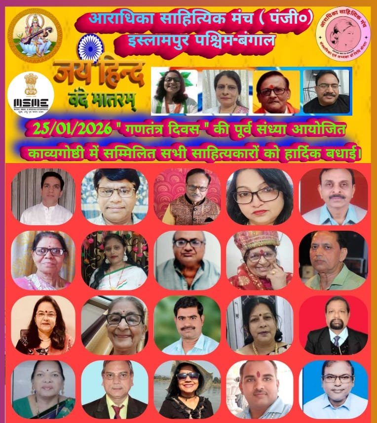 neerajtimes.com सुधीर श्रीवास्तव – आराधिका साहित्यिक मंच (पंजी.) के तत्वावधान में गणतंत्र दिवस की पूर्व संध्या पर 25 जनवरी’ 2026 को मंच की 59 वीं भव्य आभासी काव्य गोष्ठी का आयोजन ’77 वें गणतंत्र दिवस’ को केंद्र में रखकर आयोजित किया गया। जो 4.00 बजे से रात्रि लगभग 07:00 बजे तक निरंतर गतिमान रहकर भव्यता के साथ संपन्न हुई।